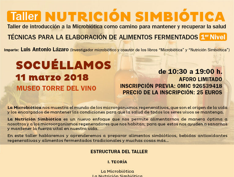 Este domingo 11 de marzo, en el Museo Torre del Vino, va a tener lugar un Taller de Nutrición Simbiótica, una jornada de introducción a la elaboración de alimentos fermentados que va a estar impartida por Luis Antonio Lázaro, investigador microbiótico y coautor de los libros ‘Microbiótica’ y ‘Nutrición Simbiótica’.