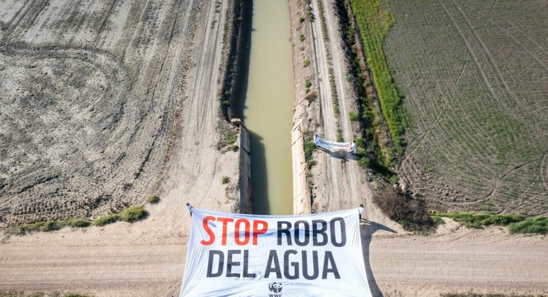La organización WWF ha desplegado tres pancartas gigantes de forma simultánea en los humedales «en peligro» de Doñana, Tablas de Daimiel y el Mar Menor para exigir el «fin de la impunidad» en el «robo del agua» en España.