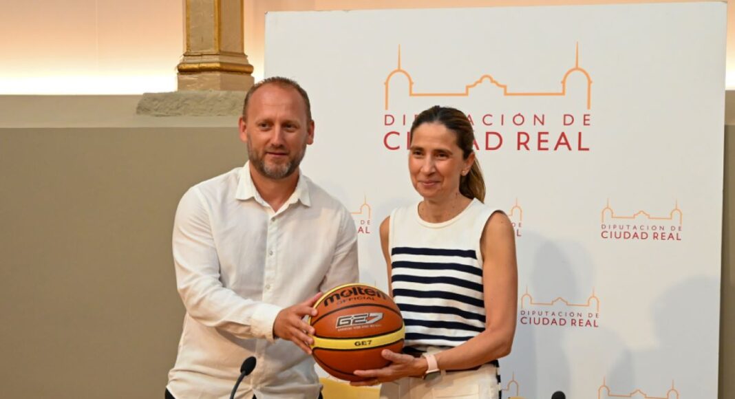 La vicepresidenta primera de la Diputación y delegada del Área de Deportes, Milagros Calahorra, junto al presidente de la Federación de Baloncesto de Castilla-La Mancha, José Esteban Gálvez, han presentado esta mañana en rueda de prensa la Copa Diputación de Baloncesto 2024 en categorías masculina y femenina, que arrancará la primera semana de septiembre.