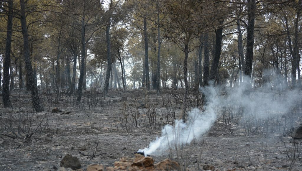 Carbonizada, consumida por las llamas. Así se ve hoy la zona del incendio localizado en el término municipal de Campillo de Altobuey (Cuenca). Un fuego que se originó tras un accidente de tráfico a la altura del kilómetro 21 de la CM-211. Dicho accidente provocó que un vehículo ardiera y que las llamas se propagaran hacia la zona del pinar, zona en la que participaron más de 100 personas en su extinción. Si bien este incendio se encuentra estabilizado y ya ha descendido a nivel 0 de emergencia, aún son visibles diversas columnas de humo en la zona.