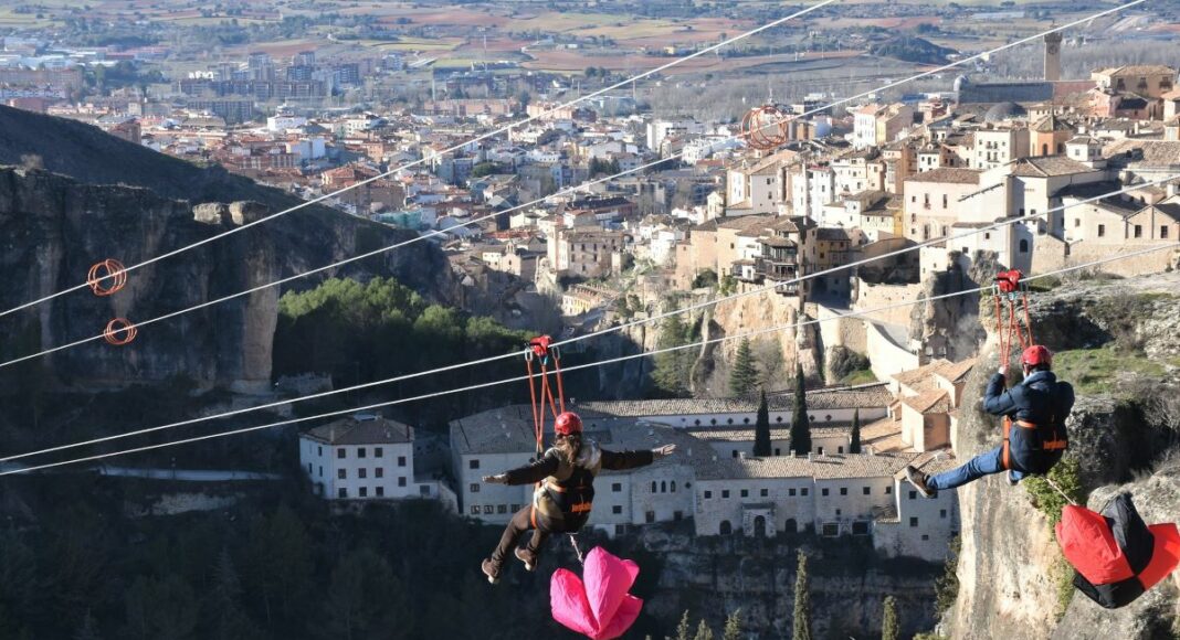Cuenca estrenará el próximo viernes la tirolina urbana doble más grande de Europa, de 445 metros de longitud con lo que supera así a la de Toledo, que tiene unos 130 metros y era hasta ahora la más larga.