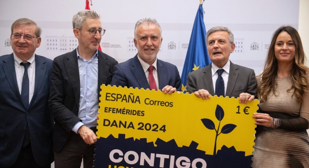 El ministro de Política Territorial y Memoria Democrática, Ángel Víctor Torres, ha presentado este miércoles el sello dedicado a la dana con el lema ‘Contigo hoy, mañana y siempre’, con el que Correos pretende recordar a las víctimas y sus familias y emitirá 70.000 sellos con un valor postal de 1 euro.