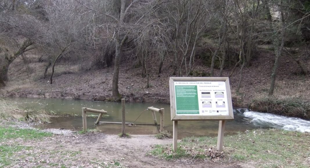 La accesibilidad del sendero no se limita únicamente a la eliminación de barreras físicas. El recorrido incorpora paneles interpretativos adaptados a personas con discapacidad visual, lo que convierte la visita en una propuesta especialmente interesante para este colectivo. La proximidad al río permite percibir de forma directa el sonido del agua, la humedad ambiental y los aromas característicos del entorno natural. El sendero finaliza junto al propio río Dulce, en una zona entarimada desde la que es posible tocar y escuchar el discurrir de sus aguas.