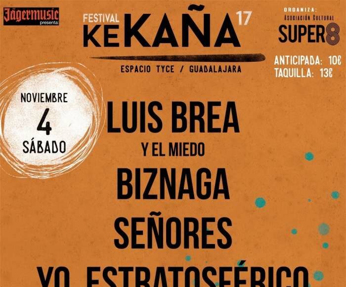 El Espacio Tyce de Guadalajara acogerá el próximo 4 de noviembre la sexta edición del festival de música independiente Ke Kaña, un evento para el que ya están a la venta las entradas y que está organizado por la Asociación Cultural Super 8, que ha elaborado un cartel compuesto por los grupos Luis Brea y El Miedo, Biznaga, Señores y Yo, Estratosférico.