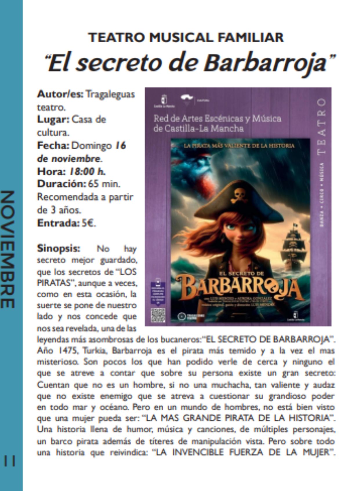 La programación cultural de otoño continúa en Bolaños de Calatrava con una cita muy especial pensada para el público familiar. El próximo domingo 16 de noviembre, la Casa de la Cultura acogerá la representación de la obra “El secreto de Barbarroja”, a cargo de la compañía Tragaleguas Teatro. La función dará comienzo a las 18:00 horas, con un precio de entrada de 5 euros, y está recomendada para niños y niñas a partir de los 3 años.