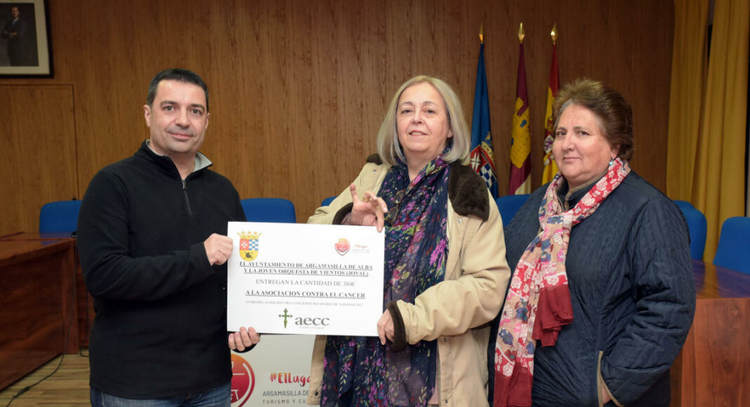 El concejal de Cultura de Argamasilla de Alba, José Antonio Navarro, ha hecho entrega a las representantes de la AECC de la localidad, Amparo Jiménez y Lourdes Sáez, de los 384 euros recaudados en el concierto benéfico ‘Melodías solidarias’, ofrecido en el Teatro-Auditorio en los días previos a la Navidad por la Joven Orquesta de Vientos de Argamasilla de Alba (JOVAL), dirigida por Miguel Carlos Gómez Perona. Una donación que fue aprobada por la Junta de Gobierno local, a propuesta del área de Cultura.