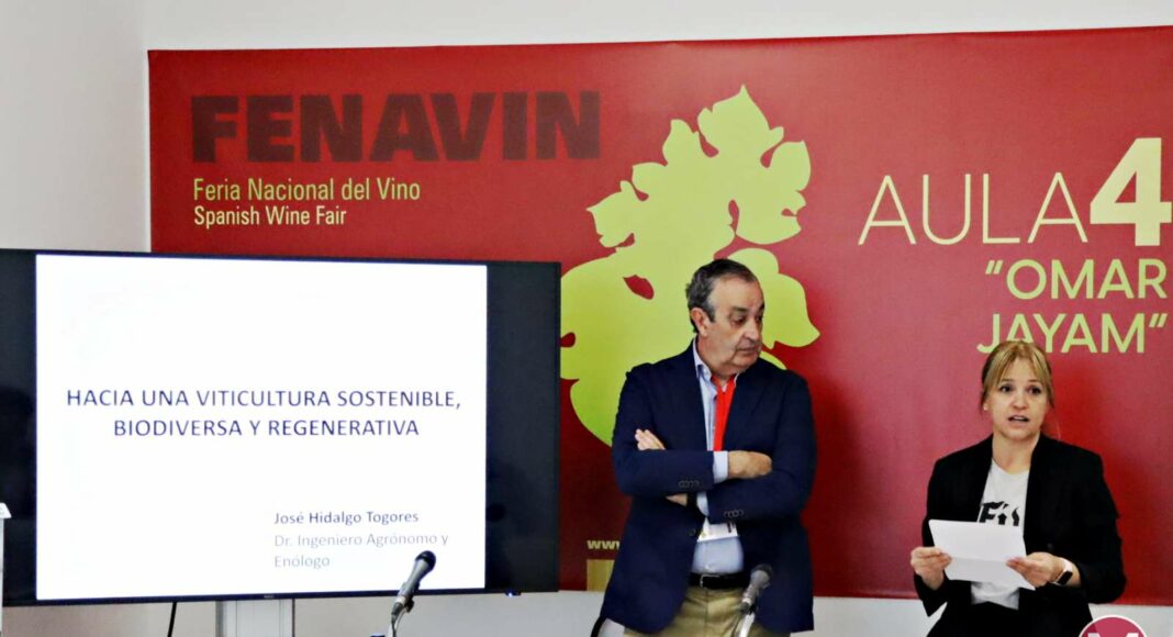 El enólogo José Hidalgo, de la bodega Vinícola de Castilla, habló en FENAVIN, Ciudad Real, de la viticultura biodiversa y regenerativa, a quien presentó Sonia Bellido, directora general de la bodega castellano-manchega.