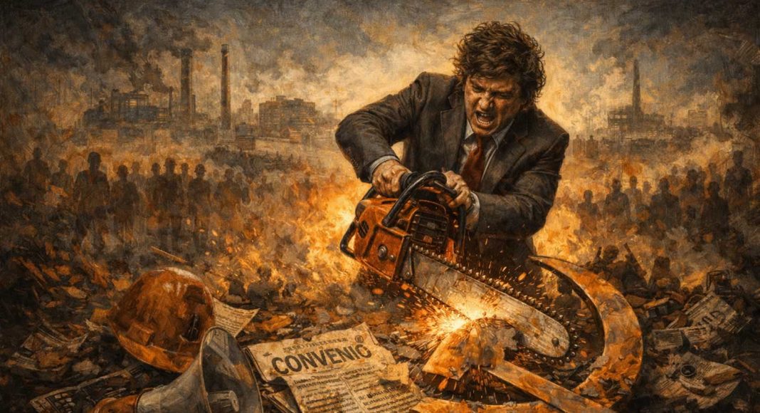 Pues bien, ya no existen. Hoy la historia se disfraza de progreso. La llamada “modernización económica” es, en realidad, un regreso a la barbarie laboral, adornada de retórica liberal y vendida como innovación. En Argentina, un país con tradición centenaria de lucha sindical y estudiantil, esta “modernización” toma la forma de Javier Milei, el autoproclamado salvador de la economía, que promete un bálsamo capaz de curar la inflación, estimular la inversión y multiplicar la riqueza nacional… siempre que el precio lo pague el trabajador.