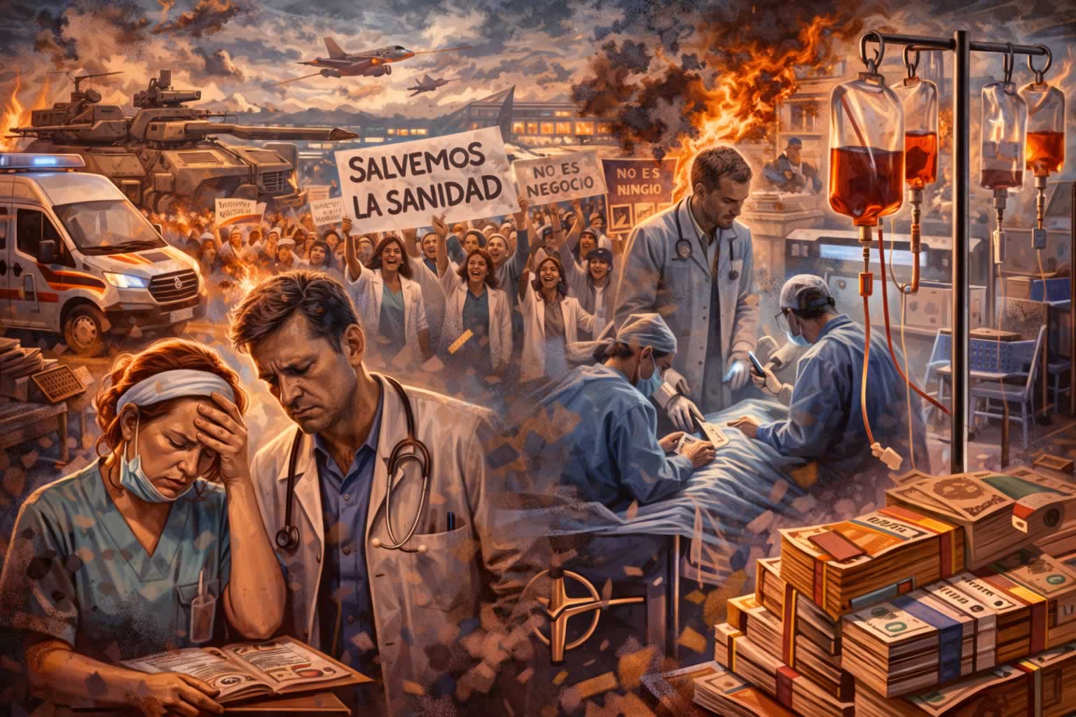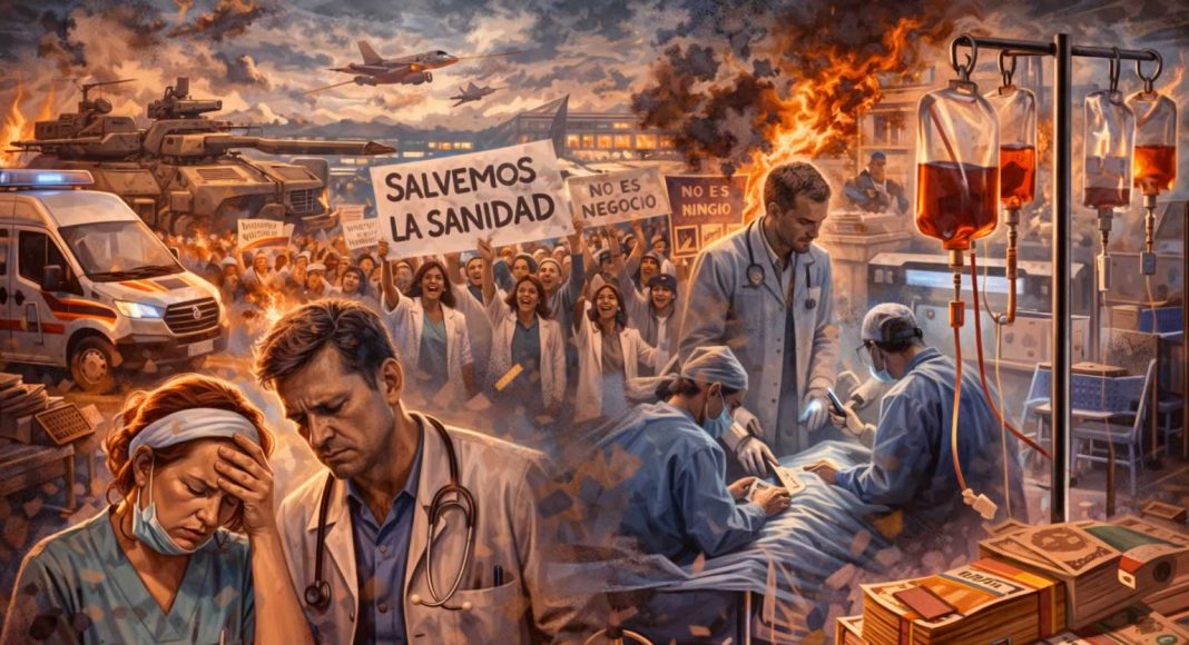 Porque lo que se presenta como protesta social contra el deterioro sanitario convive, al mismo tiempo, con el apoyo explícito o implícito de partidos que se reclaman progresistas dentro del marco institucional. Y ahí aparece la paradoja: fuerzas políticas que firman manifiestos contra la guerra mientras sostienen el aumento del gasto militar; partidos que denuncian la privatización mientras gobiernan dentro de los mismos marcos legales que la hicieron posible; formaciones que hablan de defensa de lo público mientras administran, sin ruptura real, su progresiva degradación. No es un accidente ni una incoherencia puntual. Es parte del funcionamiento normal del sistema político actual, que integra la contradicción como forma estable de legitimación.