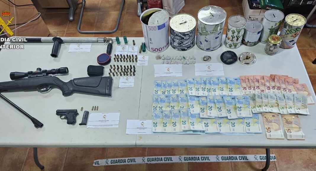 Tras un amplio dispositivo que se contó con el apoyo del GRS 6, del servicio cinológico, en concreto 3 UCEs (detección de armas, detección de dinero y detección de drogas), se intervinieron un arma larga, un arma corta, un arma prohibida de fabricación casera y casi 100 cartuchos de diferentes calibres, 13 gramos de hachís, 16 gramos de sustancia de heroína, siendo dosificadas en dos rocas y 22 dosis las cuales se encuentran plastificadas y 855 euros en diverso dinero de curso legal.
