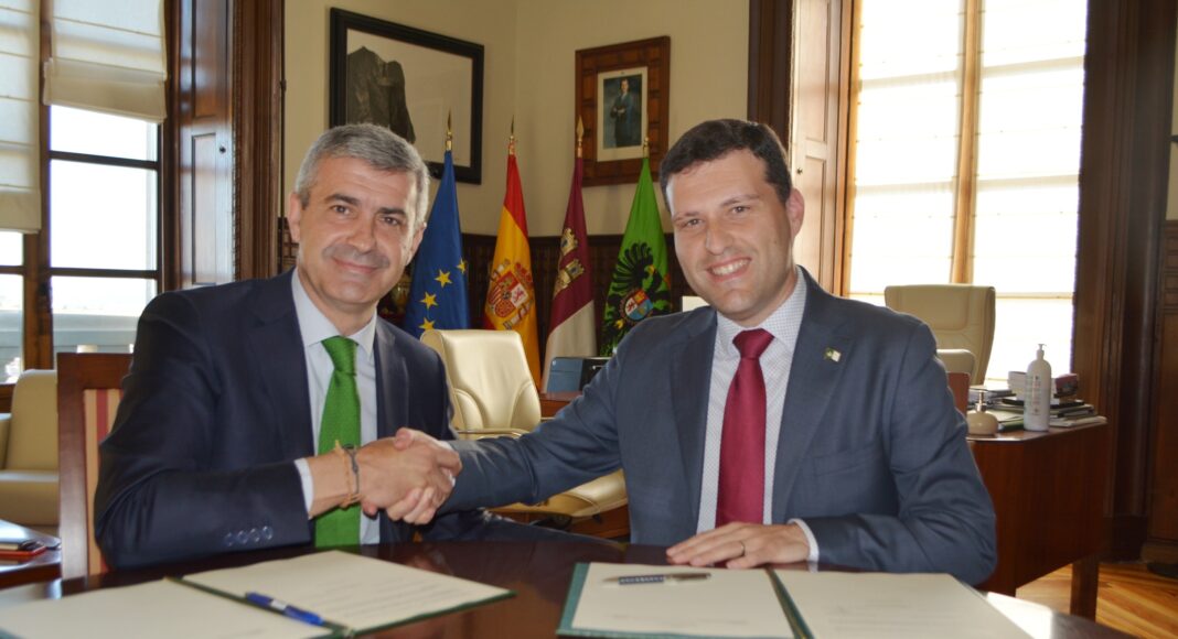 El presidente de la Diputación de Toledo, Álvaro Gutiérrez, y el alcalde de Fuensalida, Santi Vera, han suscrito el convenio que regula la colaboración de la Institución provincial con el Ayuntamiento.