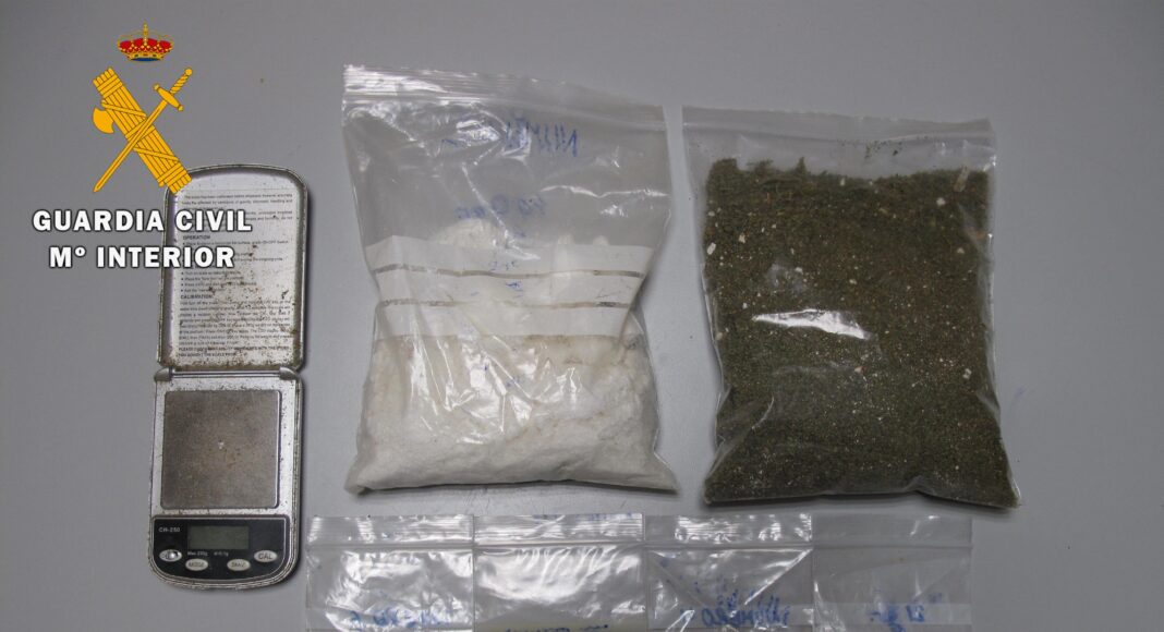 Los agentes de la Guardia Civil interceptaron el vehículo e identificaron a sus dos ocupantes para seguidamente inspeccionar su interior donde hallaron, en distintos espacios de su habitáculo, tres bolsas de plástico que contenían 422 gramos de cocaína, 170 gramos de marihuana, 5,8 gramos de hachís y una báscula de precisión.