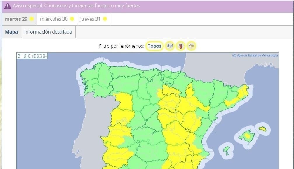 Además, se alcanzó una velocidad máxima de viento de 85 kilómetros por hora en Plasencia y rachas de misma intensidad en Segovia (Aldeanueva de Serrezuela) y en Teruel (Muniesa).