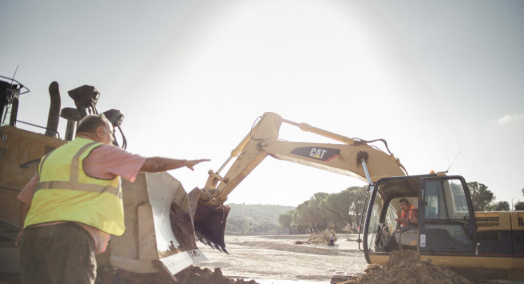 La tubería, sostenida por unos pilares que la riada arrasó, ahora se mantiene por su propia estructura, motivo por el que no está en funcionamiento. La UME ha movido 600 toneladas de tierra para construir una escollera que desvíe el caudal del río y posibilite la construcción del pilar que sujetará la tubería.