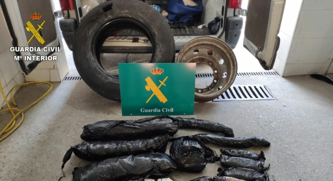 Tras desmontar el neumático y la llanta comprobaron que en su interior había un total de 18 fajos de marihuana envueltos en plástico, que arrojaron un peso aproximado de 7 kilogramos.
