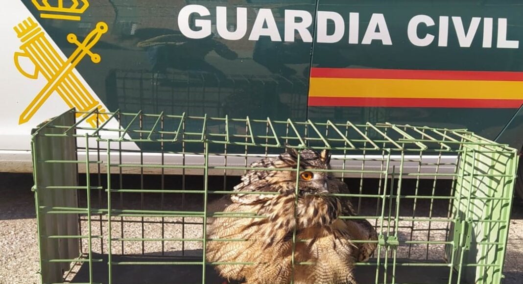 La Guardia Civil ha recuperado con vida un ave rapaz, más concretamente un espécimen de búho real, que se encontraba malherido tras chocar contra un tendido eléctrico en la localidad de La Pueblanueva (Toledo).