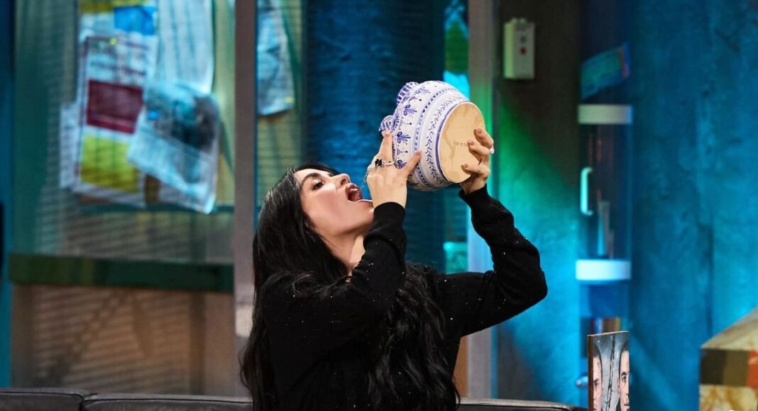 Combinando los colores azul y blanco, el botijo ha sido protagonista de una escena cómica donde tanto David Broncano como su invitada, Lali Espósito, probaron la hazaña de beber agua desde el propio recipiente.