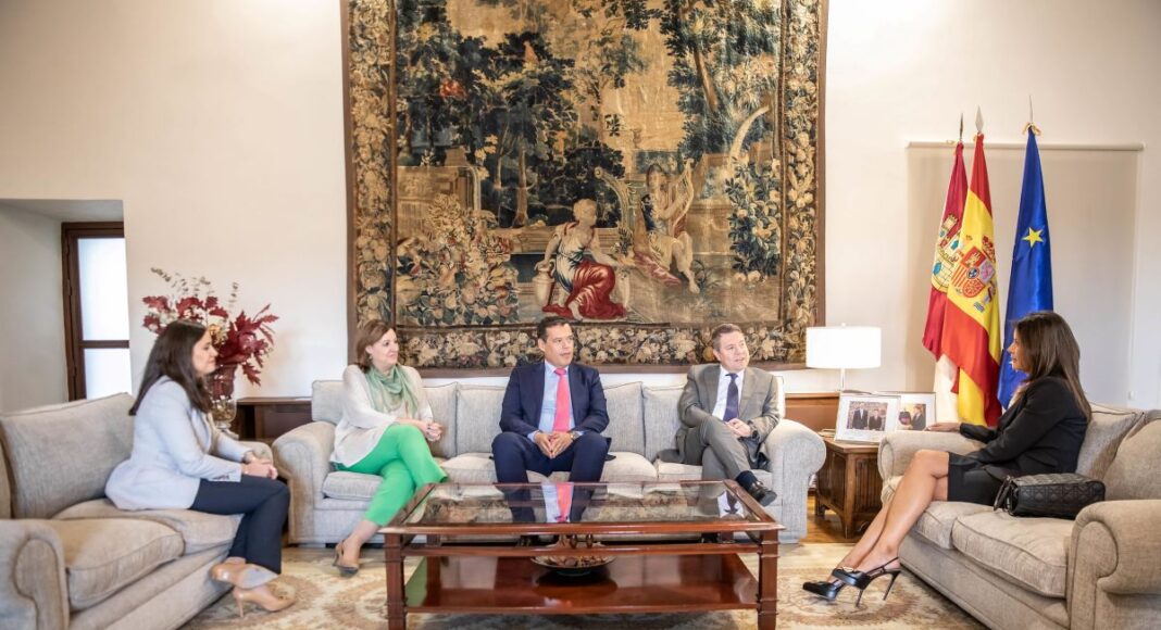 El presidente regional, Emiliano García-Page, acompañado por la consejera de Economía, Empresas y Empleo, Patricia Franco, se ha reunido este jueves en el Palacio de Fuensalida con el empresario responsable de la inversión, Roberto Angulo, de la empresa José Sánchez Peñate.