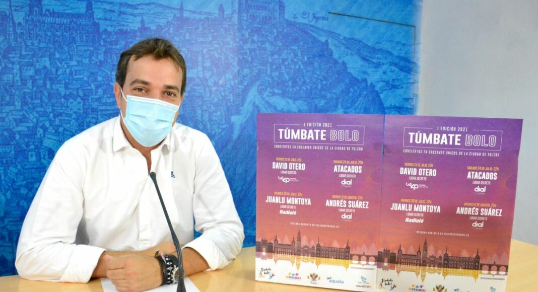 El concejal de Juventud de Toledo, Pablo García, ha presentado este martes el nuevo programa de conciertos gratuitos ‘Túmbate bolo’ que en su primera edición contará con las actuaciones en directo y al aire libre de Andrés Suárez, David Otero, Atacados y Juanlu Montoya.
