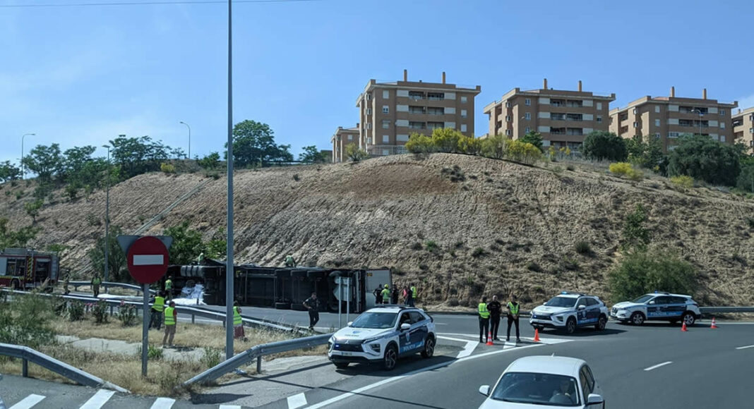 Hasta el lugar se han trasladado efectivos de la Policía Local, bomberos de Toledo y una ambulancia de urgencias. A consecuencia del accidente, el camión ha perdido parte de su combustible. Una grúa será la encargada de retirar el vehículo.