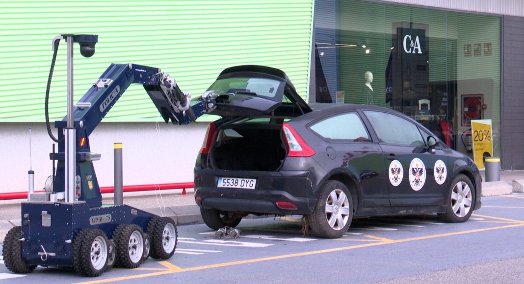 Después de que los perros policía hayan marcado la presencia de explosivos en el coche, ha llegado el turno de intervención del Aunav 75, el robot utilizado por los Tedax que ha tenido como misión forzar la cerradura del maletero del vehículo y abrir la puerta posteriormente sin arriesgar la vida de ningún agente.